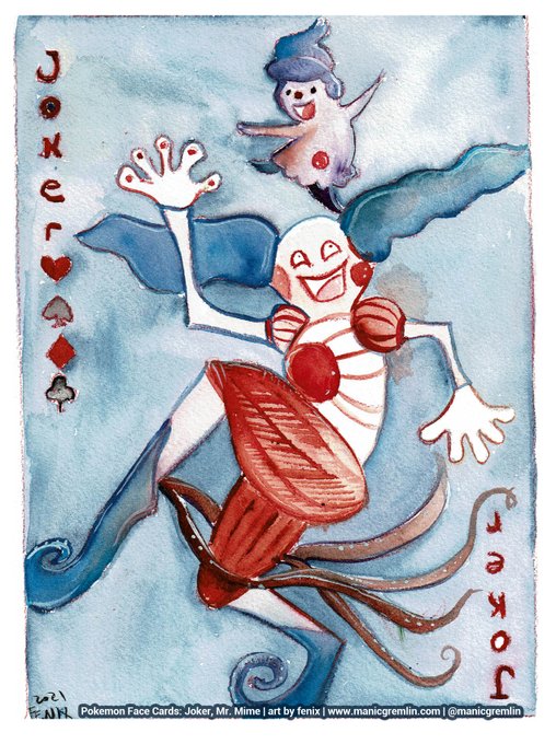 More of the Face Card inspired pokemon pieces: Mr.Mime/Mime Jr as a joker card! i kinda love that "clothes" on pokemon are actually just fleshy bits on them so it has this real sneaky body horror aspect XD this was a spooky patr0n reward for sept #pokemon #mrmime #watercolor