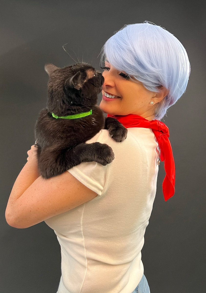 Wrapping up #caturday with kisses from Tama. Don’t tell Dad… all he ever does is keep the poor cat hung over his shoulder! Guest appearance by Panther as Tama #bulma #cosplay #bulmabriefs #bulmabriefscosplay #mrsvegeta #dragonball #dragonballcosplay #dbs #dragonballsuper