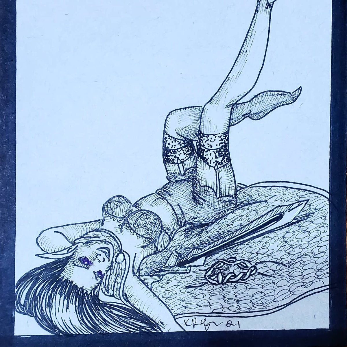 Day 13 and day 3 of the #pinupgirl set of #mtgcommander s for #inktober2021 and #magictober . Today features a very flirty Lathril, blade of Elves. #altartcards #customcards #elf