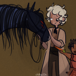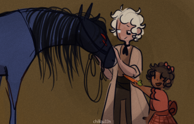 Some care for Crimson, he is a good demon horse. This is from my Royal au, Aziraphale and Muriel (his adopted Daughter here) Request: @blazenfire223 --- #GoodOmens #aziraphale #GoodOmensFanArt #Muriel #Royalau