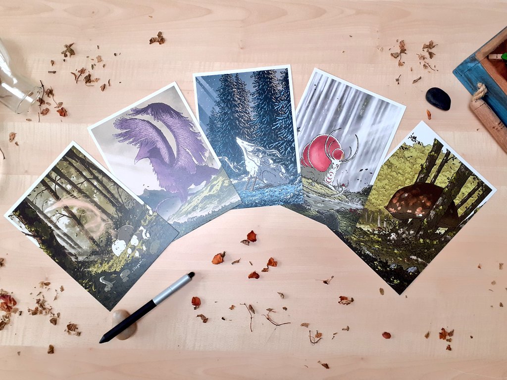 Vous reprendrez bien un supplément champidragons pour votre salade ? 🥗🍄🐉 Les 5 champidragons de 2020 dans leur nouvelle forme ! Print A5 : 30 exemplaires seront dispo aux #aventuriales et 30 sur la boutique en ligne bientôt ! #mushroomsmaugust #smaugust #dragon #art #print