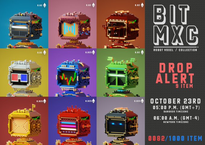 "DROP ALERT" - "BITMXC || Robot Voxel" ! 0070/1000 Item Sold out ! Saturday 23rd. there will be a New drop 9 ITEM at 5:00 P.M.(GMT+7) Bangkok 6:00 A.M.(GMT-4) NEWYORK Price : 0.02 - 0.025 $ETH opensea.io/collection/bit… #mxcstories #BITMXC #NFT #NFTs #nftcollector #voxelart