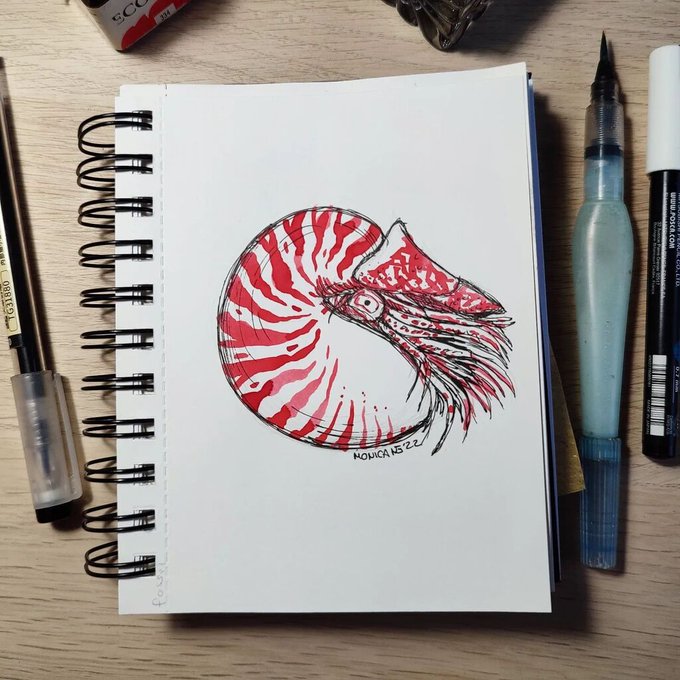 After recently drawing the ammonite equivalent of a pizza cutter I needed to do something a but wider so here's a young Eutrephoceras dekayi, a Late Cretaceous nautiloid, chilling near a crinoid. #nautilus #paleoart #digitalart #cretaceous #sciart