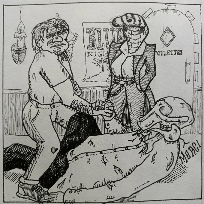 We had a few canal signal issues last so yesterday's #inktober #drawing with the prompt #extinct is coming attcha now. This panel in my #inktober2021 #comic has a #neanderthal barman helping Louis Baptiste up.