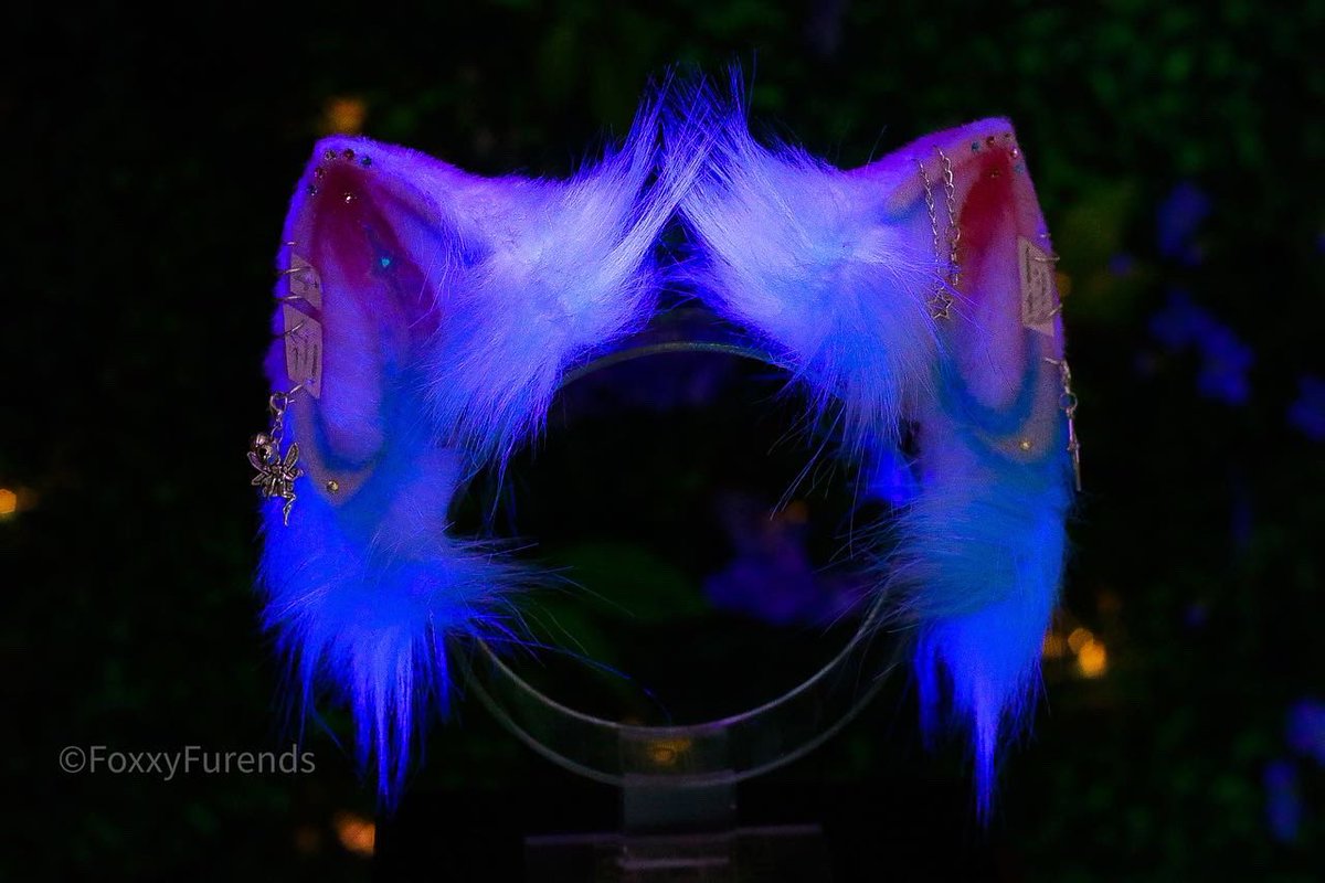 DEETS; 🌸2.5” tall 🧚♀️Silver hardware 🌸Luxury faux fur 🧚♀️Airbrushed 🌸Fixed rhinestones 🧚♀️Genuine Swarovski crystals 🌸Fully posable 🧚♀️Slide along headband 🌸Removable accessories 🧚♀️Hoop piercings 🌸UV Reactive 💖Handmade with Love💖 • #cosplayears #nekoears #cosplay