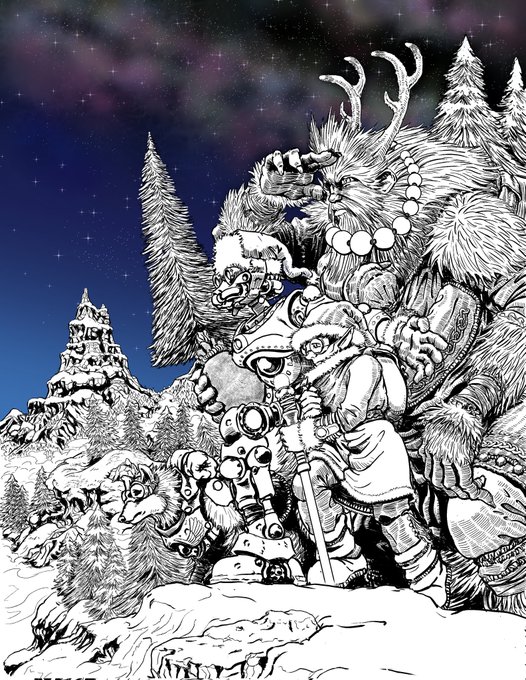 Another card illustration idea...🤓#neonseedstudios #steampunk #clipstudiopaintex #holidaycards #mecha #mech #robot #bot #wolf #elf #yeti #abominablesnowman #illustration #christmas #yule #holidays #christmascard #snow #fantasyart #dailydrawing #ArtistOnTwitter #art #drawing