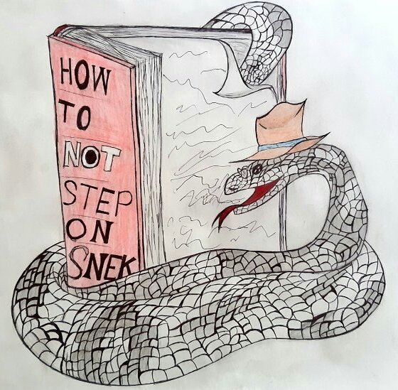 A snek with a cowboy hat and glasses reading a red book. Follow me or ill step on him. #art #arte #ArtistOnTwitter #artistsontwitter #drawing #drawings #drawingart #illustration #illust #inktober2022 #Inktober #nosteponsnek #Doodles