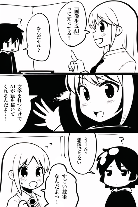『ネームがあったらAIで漫画は描けるのか』考察 3枚目を指示画像に Strength:0.75 文字指定は「pixiv, girl, dinamic pose, manga, white and black, comic,」 2枚目が生成されたので最低限の加筆修正写植して1枚目に 絵が描けなくても漫画を発表できるようになる時代だ #NovelAIDiffusion #novelAI