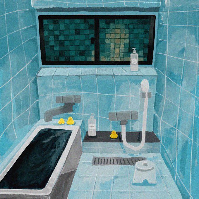 #nowakiイラスト 課題「気配のあるイラスト」 左が元絵、右がタケウマ先生に描き加えていただいたものです。 視線を湯船→小物→窓に誘導したくて湯船を黒くしましたが、「怖さ」が湯船と窓で分散されるので、湯船の怖さを抑えつつ視線を集められると窓の怖さが引き立つ…!勉強になりました✏️