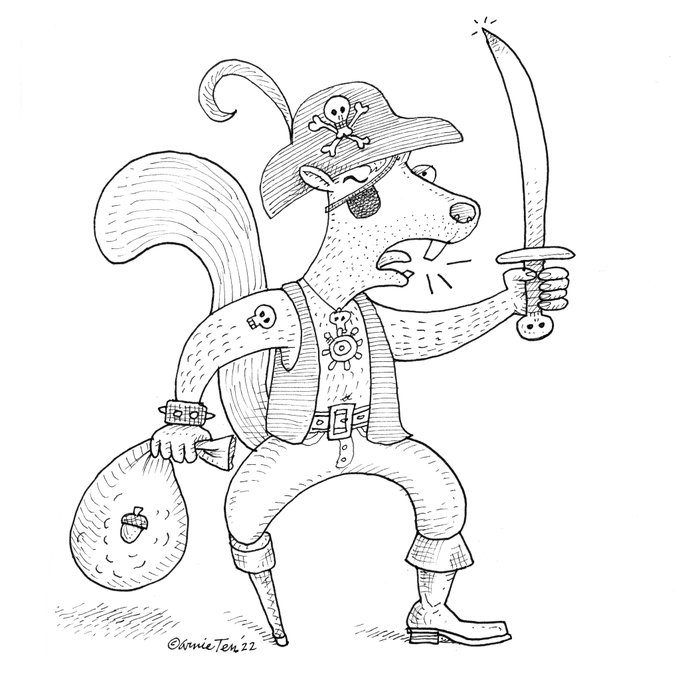 Arrrg! Booty's in me bag an I'm feeling salty! #inktoberday #inktober2022 #day17 #kidlit #kidlitart #penandink #characterdesign #nuts #talklikeapirate