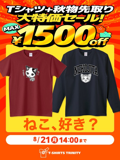 #Tシャツトリニティ #セール 2023年8月18日(金) ~ 8月21日(月)14:00 ドライTシャツ全品1,500円引き TシャツロンT七分袖T全品1000円引き nya-mewもよろしくね ttrinity.jp/shop/nya-mew/d… #nya_mew #子猫 #イラスト #絵描きさんと繋がりたい #kitten #猫Tシャツ #みんなで楽しむTwitter展覧会 twitter.com/tshirtstrinity…