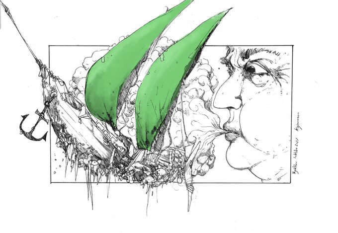 Jour 15. "Casque" + "Voilier Volant" + "Vert". Bon ok, on voit peu le casque, mais bon, il y est :p #quickdraw #drawing #nyoctober #inktober