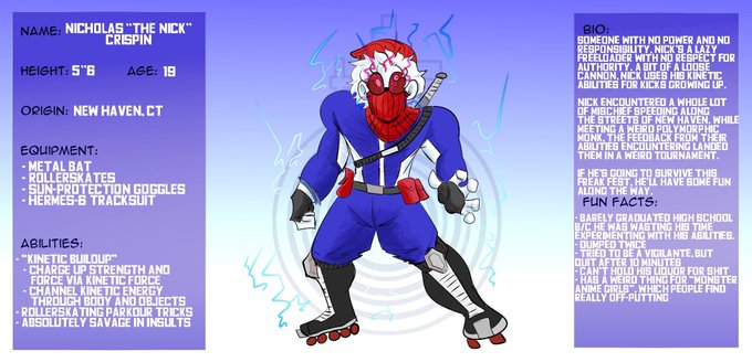 My Round 1 submission for @ExcaliburOCT - Rollerblade Run! Featuring Nicholas “The Nick” Crispin! (1/5) (mind the varying styles, I was trying to find a concrete one before things got crazy) #oct #originalcharacters #digitalart #ArtistOnTwitter