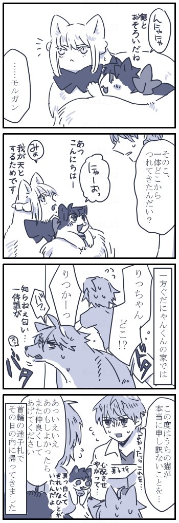 お題箱よりネコチャン漫画 > LB7主従にゃんこのハナチューとか毛づくろいとか見たいです!!!!! #odaibako_hook2_62 odaibako.net/detail/request… 4コマに無理やり詰め込みました…ぐだくんを気にせずいちゃつくネコチャン…