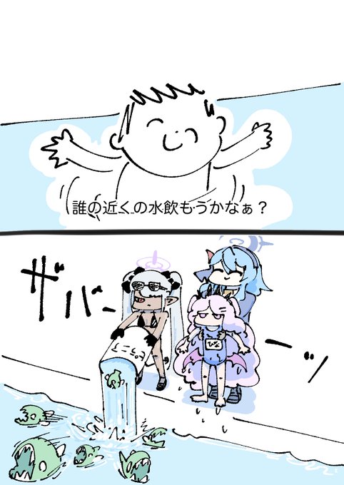 > イオリとヒナが入ってるプールの水を飲もうとする先生(アロナの似顔絵ver) https://mobile.twit… #odaibako_humeiryou odaibako.net/detail/request… お題ありがとうございました