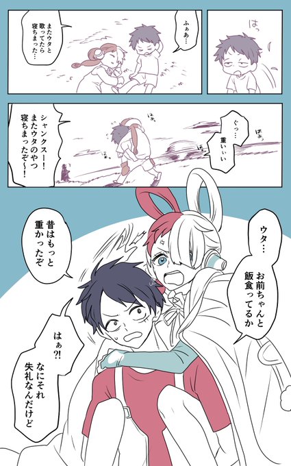 おんぶルウタ > 歌ったことで疲れて眠ってしまったウタをおんぶして帰るルフィが、昔もこんなことしたなと思い出しているシーン。 #odaibako_midoromol odaibako.net/detail/request…