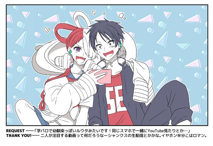 > いつも可愛いルウタで助かってます 「大学生ウタと高校生ルフィの現パロルウタ」をお願いします! #odaibako_midoromol odaibako.net/detail/request… 二人の再会はいつでも青天の霹靂のようであってくれたらとおもうのだった~ 年齢差サンキュー
