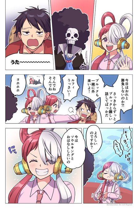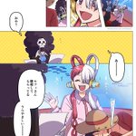 かまってちゃん船長なルウタ! > ブルックとウタが音楽に着いて語ってるのところをつまんなそーに聞いているルフィ #odaibako_midoromol 元気玉👏wavebox.me/wave/15nnjum1s…