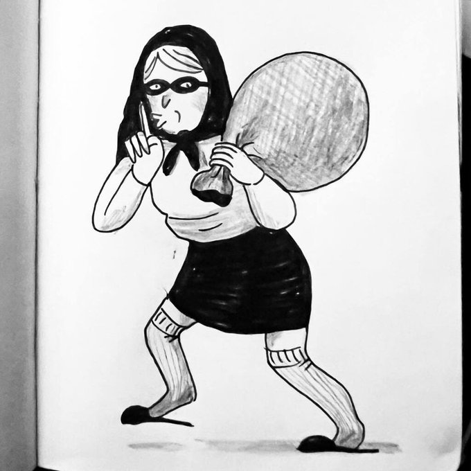 Even old ladies have tornadoes to an #heist these days… for the 22bd day of #inktober 💰 #doodle #oldlady #thief #artwork #inktober2022 @inktober #ink #illustration #art #sketch #sketchbook
