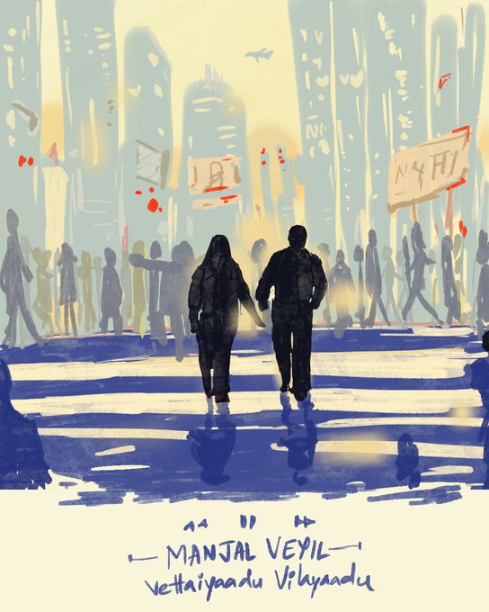 31 days, 31 sketches: #Inktober Last year @CuriousPoonai @OpinionPakoda & @extradecoction started #OliyumOliyumInktober : everyday they'd post a Tamil song which we would turn into sketches✍️ Starting this year's challenge with Day 1: Manjal Veyil from Vettaiyaadu Vilayaadu