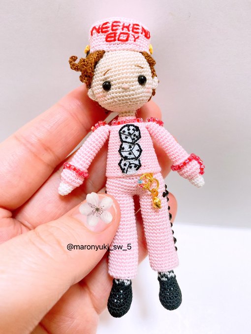 この前ジョンヒョンを編んだ後にすぐ編み始めたDICE衣装のオニュが完成したよ😘 軽い気持ちで編み始めたら、サイコロ部分で諦めかけたけど何とか出来た🤣 困り顔になったけど可愛く出来たよ💕 #amigurumi #あみぐるみ #onew #オニュ #ONEW_DICE #ミシン糸 #シャッペスパン