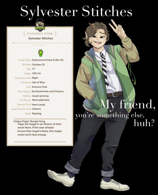 Next up is our boy Sully! He’s based off Oogie Boogie and is basically if Gengar’s color palletn was beige and green. Super friendly and SUPER unsettling. #twst #twstoc #twistedwonderland #twstプラス #twstファンアート #diasomnia #disomniaoc #oogieboogie