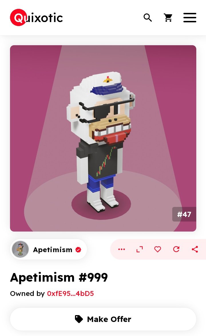 This @apetimism just sold at Ξ0.999 on @quixotic_io #Optimism ! We are 3,999 collectible characters with a mission to find NFT's sustainable value with Doxxed SE Founder. #NFTCommunity #voxelart #TheSandbox #NFTTHAILAND #ALPHA #SOLDOUTin10min