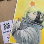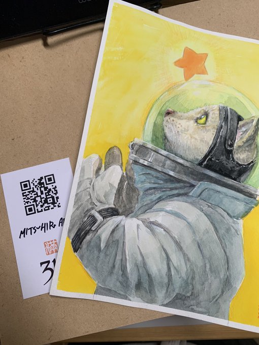 preparing for shipping. Most of the original pictures I'm auctioning were drawn in my YouTube Live Painting. It comes with a card. And you can watch the complete process of making your piece with the QR code on it. #MitsuhiroArita #auction #watercolor #originalpainting #star #cat