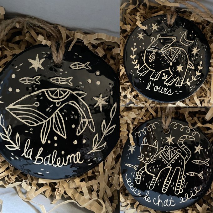 I made ornaments! A bear, a whale, a cat, an elephant and a monkey. #handmade #pottery #ornaments #artist #bisque #sgraffito #animals #illustrator #love