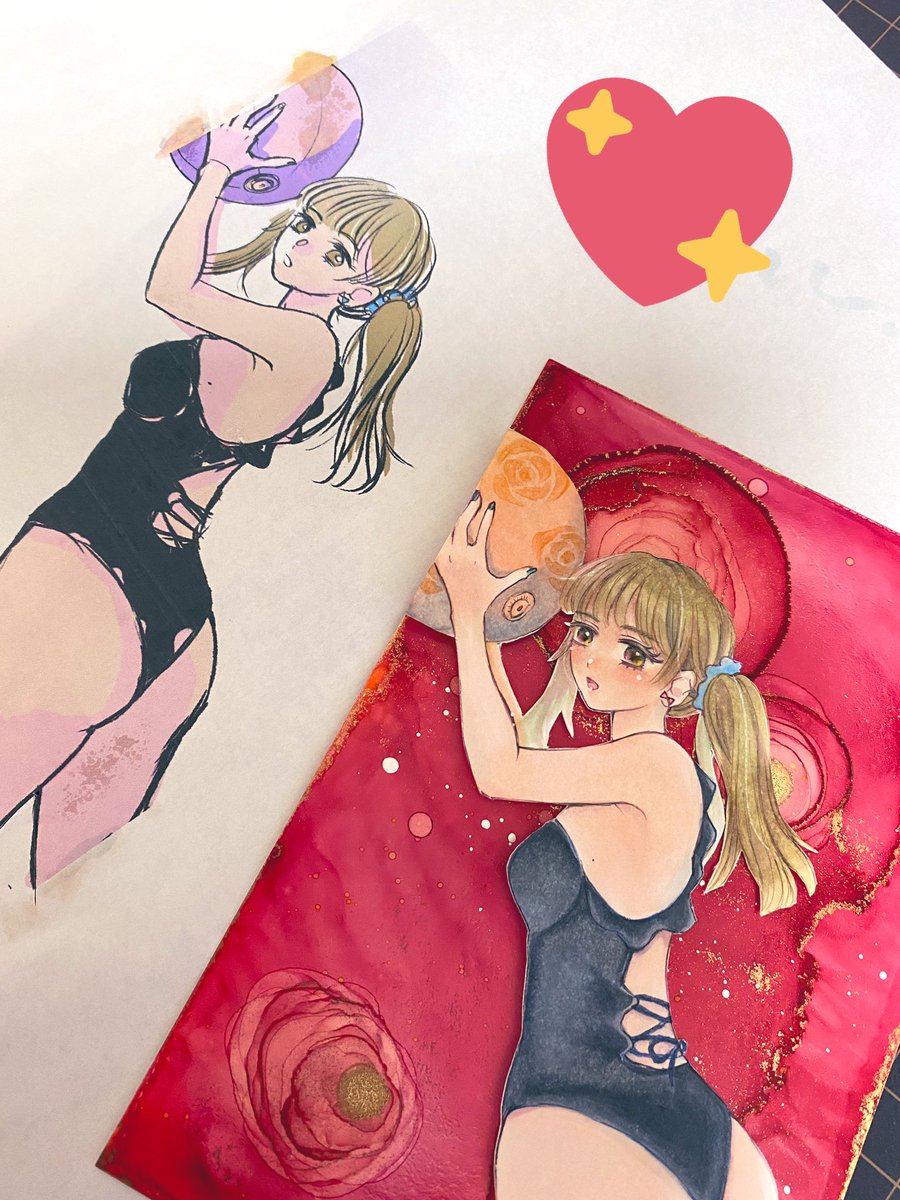 夏は褐色女子もいいよねぇ🥹💓 コピックで表現するのは難しいんだけど 無事こんがりできました✨ 今度褐色用のオリジナルインク作ろうかなぁ…🤔 #our_exhibition 夏展 #アナログイラスト #創作イラスト #アルコールインクアート #コピック #夏