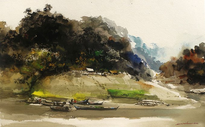 Sangu river bank. Ruma. Bandarban. watercolor by Shahanoor Mamun video link - youtu.be/7ohBdiIfDWU . #shahanoormamun #pleinairpainting #pleinairwatercolor #outdoorwatercolor #bandarbanpainting #watercolorbyshahanoormamun