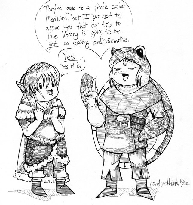 Me dropping everything because I HAD to draw Dob in a tortle costume conferring with Merilwen that their trip to the library will be JUST as good as a trip to the casino. AND SHE AGREED SO STRONGLY. #Inktober #Inktober2022 #Oxventure @Oxventure
