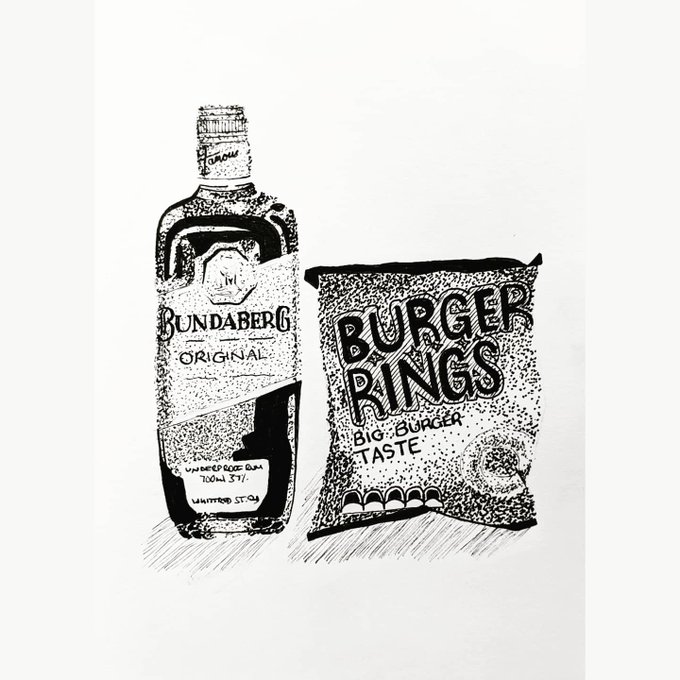24. Nostalgia (Australian treats 😋) #artober #drawtober #inktober #ink #draw #drawing #inkdrawing #artoberartistthelp #australia #oz #ozzy #aussie #bundaberg #rum #burgerrings #crisps #chips #nostalgia