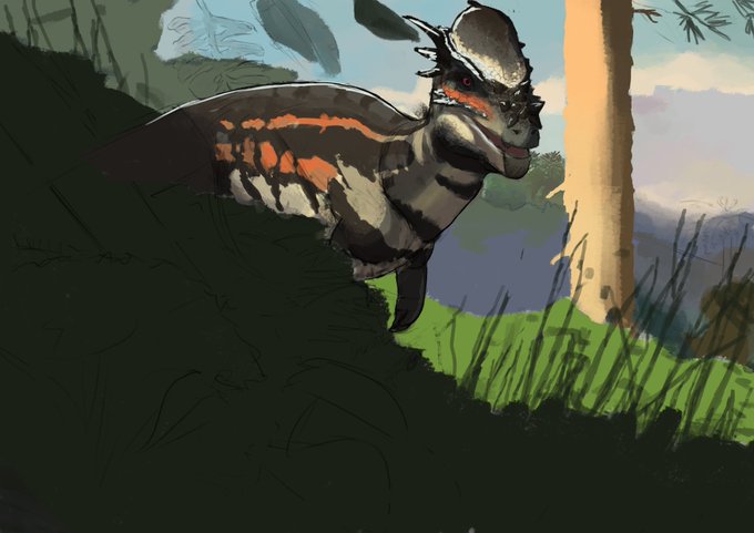 Alright, back at the Pachy piece, took some time to continue because my PC is being a pain, but I'm loving the result so far! One problem tho, Idk exactly wich light mood I wanna go with. What do you guys think? #WIP #paleoart #digitalart #dinosaur #pachycephalosaurus #sciart