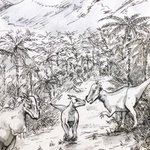 Warm-up! Based on the hypothesis/theory that Pachy may be omnivorous. A pachycephalosaurus kills a Dakotaraptor chick, trying to scare a young T.rex away... without realizing Momma's angry. #pachycephalosaurus #trex #paleoart #tyrannosaurusrex #paleontology #dinosaurs