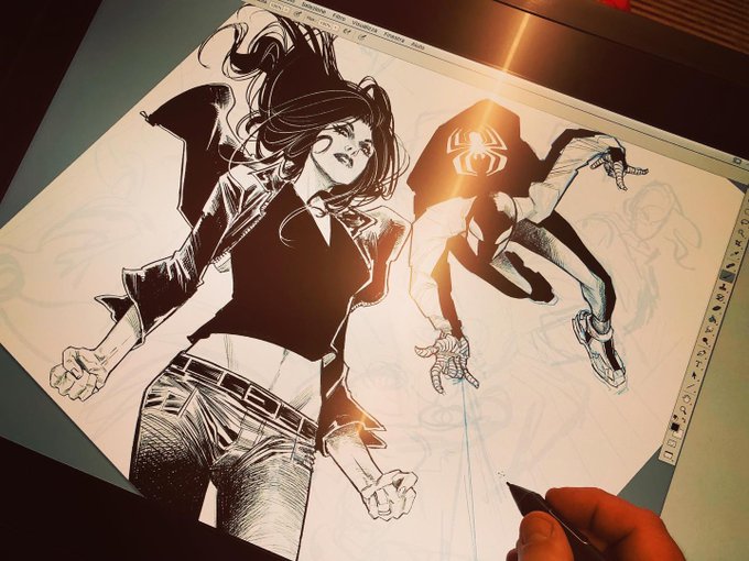 First panel of 2022. #WIP. Devil’s Reign. Jessica and Miles. #devilsreign #marvel #chipzdarsky #marcochecchetto #ink #pencil #art #marvelcomics #page #comics #comicbooks