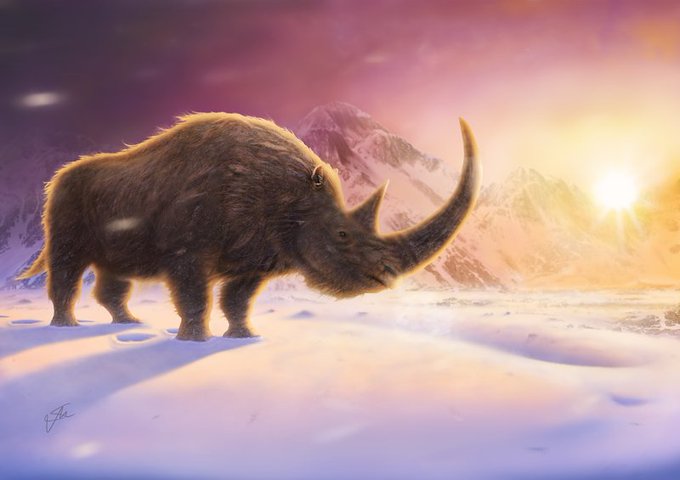 Coelodonta antiquitatis (rinoceronte lanudo) aprovechando los últimos rayos de sol. Primera ilustración del año y la más complicada que he hecho hasta ahora🦏 IG: @paleoarteymas #paleoart #paleoartist #paleontology #digitalart #digitalillustration #digitalpainting #digitaldrawing