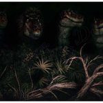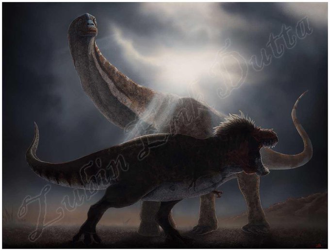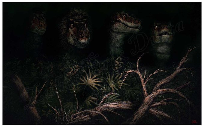 A pack of #Tarbosaurus hunting at night. Done for #Halloween2022. #tyrannosaurus #tyrannosaurid #theropod #dinosaur #dinosaurart #paleoart #paleontology #paleobiology #art #painting #traditionalart #wildlife #horror