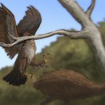 Results from the silly April's Fool #Paleostream Hieraaetus moorei (for @ILamantino) Parvicursor (NOT THE BEES!), Bagaceratops (jumping over Shri) and Magallanodon (spraying a juvenile megaraptoran in the face)