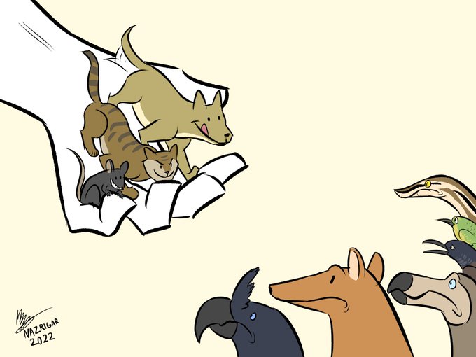 Today's Paleovember Doodle: The Fragility of Island Ecosystem, as I've noticed it's usually a combination of rats, cats and dogs, familiar furry friends, that tend to wreck shop as much as we do. #paleovember #paleovember2022 #paleoart #thylacine #dodobird #artistsontwitter