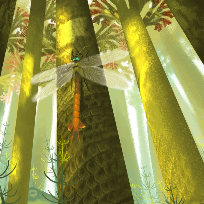 Another carboniferous painting, going for something more stylized this time #art #digitalart #illustration #insect #paleoart #carboniferous #meganeura #griffinfly #lepidodendron #scaletrees #clubmosses #paleozoic #Palaeozoic