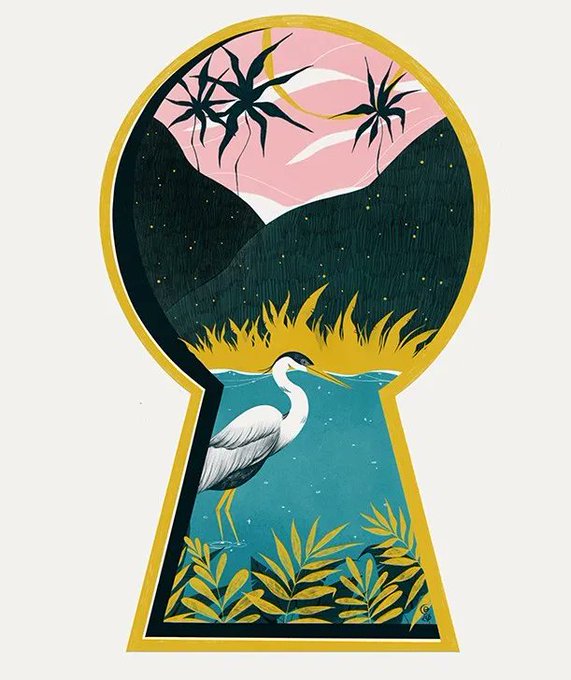 "Other Side" by Carmen Deñó. Explore her portfolio: buff.ly/3lkFZW1 #carmendeno #latinamerican #surreal #landscape #heron #wildlife #palmtrees #stylized #decorative #whimsical #travel #keyhole #illustration #illustrator #conceptual #conceptualillustration #art #bhfyp