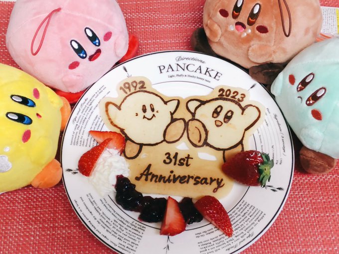 無事、娘のおくちへ吸い込まれました( 'ч' ) 茶色ちゃんがつまみ食いしたみたいで可愛い😆 #パンケーキアート #pancakeart #カービィのハッピーバースデー #Happy31thBirthdayKirby twitter.com/euLoW38rci38XD…