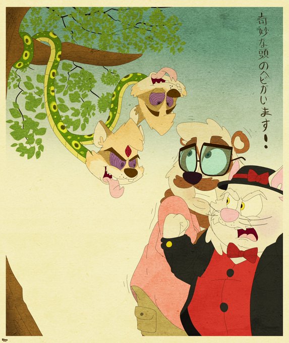I drew again in the Ukiyo-e style of woodblock print from Japan. This time drawing my friend's amazing OC characters, @RoxbyBear and @Mc_Nooget which showed they were shocked to see the strange head snake!😁 I hope you like it ^^ #ukiyoestyle #giftart #ocfanart #pandabear #cat