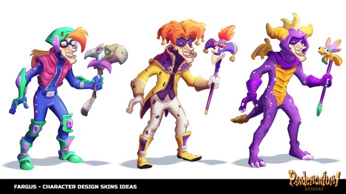 Ideas for reskins of the Pandemonium characters, based on the japanese version, 2 and the modern Activision properties. #pandemonium #game #videogames #TFB #toysforbob #90s #fun #cartoon #stylized #jester #crazy #art #spyro #ArtistOnTwitter #ActivisionBlizzard #joker #conceptart