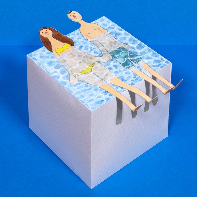 No.25 プールの二人 立方体の一部を切った感じ。 水彩絵の具で塗ってみたけど、難しい。 #立体 #紙工作 #ペーパークラフト #papercraft #paperart #papersculpture