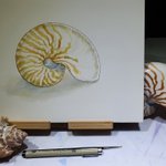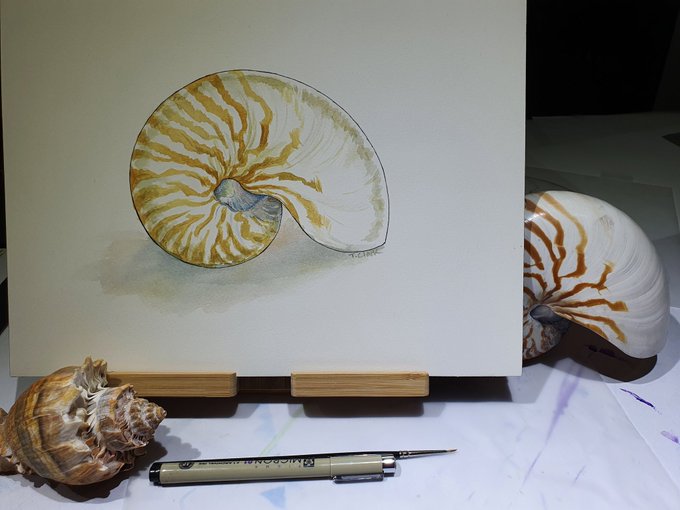 Nautilus, beautiful living fossil with its spiral fanning outward, mollusc of the open water, Ancient Greek for sailor 🌊🌀 #sciartober ~ shell #inktober ~ fanned #sciart #gnsi #watercolorandink #inktober2021 #patternsinnature