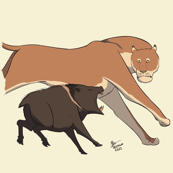 Today's warmup, an angry Platygonus, AKA a big ol' peccary, chases an American Lioness. Inspired by @HodariNundu 's own big ol' peccary drawing and @ausar_the 's post of goofy looking scary animals. #peccary #americanlion #paleoart #paleontology #pleistocene