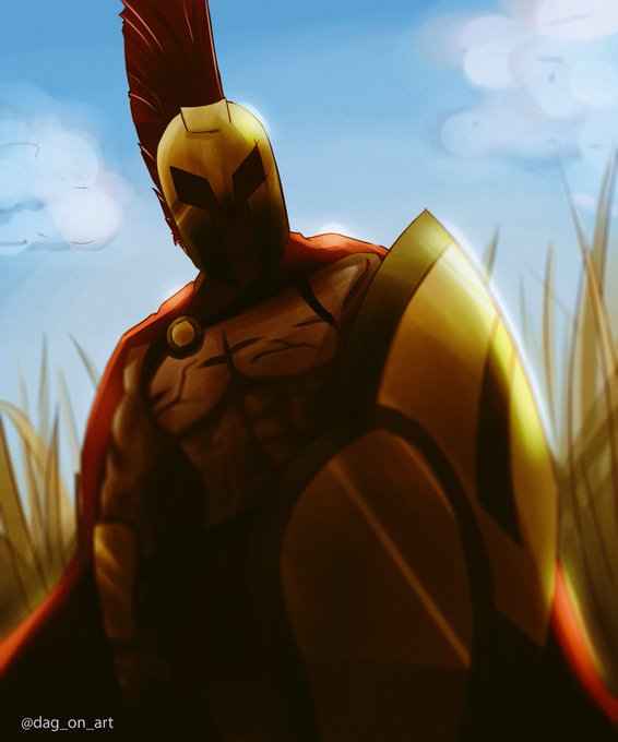 Inktober day 15 Helmet Yes. Helmet. #art #artist #ink #inktoberday15 #inktober #inktober2021 #pentablet #painting #sky #digitaldrawing #drawing #digitalartist #digitalpainting #digitalart #man #warrior #helmet #cape #spartan #fighter #shield #gold #red