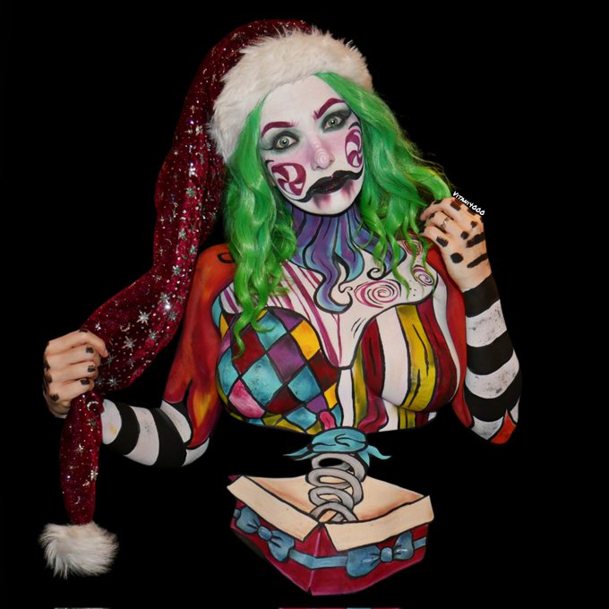 Hi, I'm a Christmas Clown/Jack in the box 👀 ✨ This is #bodypaint ✨ Painted by me on me 🎨 #clown #makeup #cosplay #Christmas #yule #peppermint #jackinthebox